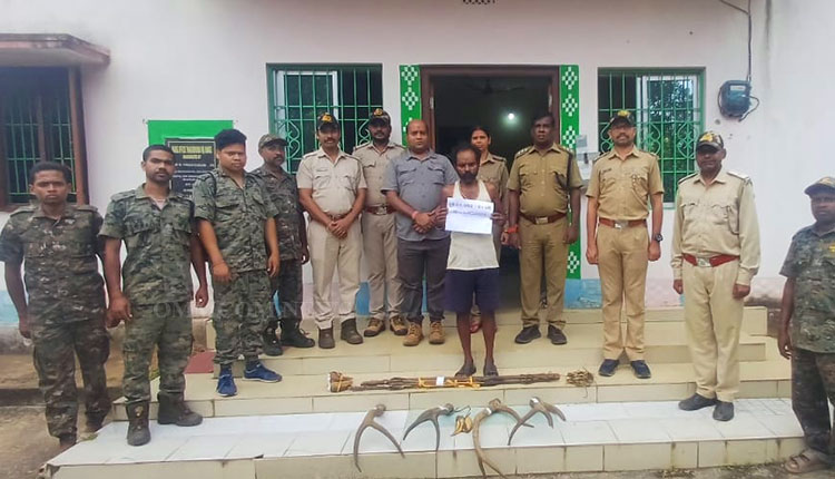 Baripada (Mayurbhanj): The Forest Department successfully arrested a poacher in the Similipal forest area on Monday, leveraging Artificial Intelligence (AI)-enabled Trailguard cameras under the Thakurmunda Wildlife Range of Mayurbhanj district.The accused has been identified as Kunja Sae (40), a resident of Keshdiha village under Mahuldiha police station.According to Samrat Gowda, Deputy Director (South) of Similipal Reserve Forest, the AI Trailguard camera captured the poacher attempting to enter the Similipal Wildlife Sanctuary. Acting swiftly on this lead, the field staff of the Thakurmunda Wildlife Range initiated an extensive search operation. Ground intelligence further aided the investigation, leading to a raid on the suspect’s residence.During the operation, forest officials seized multiple wildlife contraband items, including four sambar antlers, one hornbill beak, 137 bird snares, three bows, and eight arrows.The accused was subsequently produced before the Chief Judicial Magistrate (CJM) Court in Baripada, Mayurbhanj, following all due legal procedures.This successful operation highlights the growing role of AI technology in wildlife protection and anti-poaching efforts.