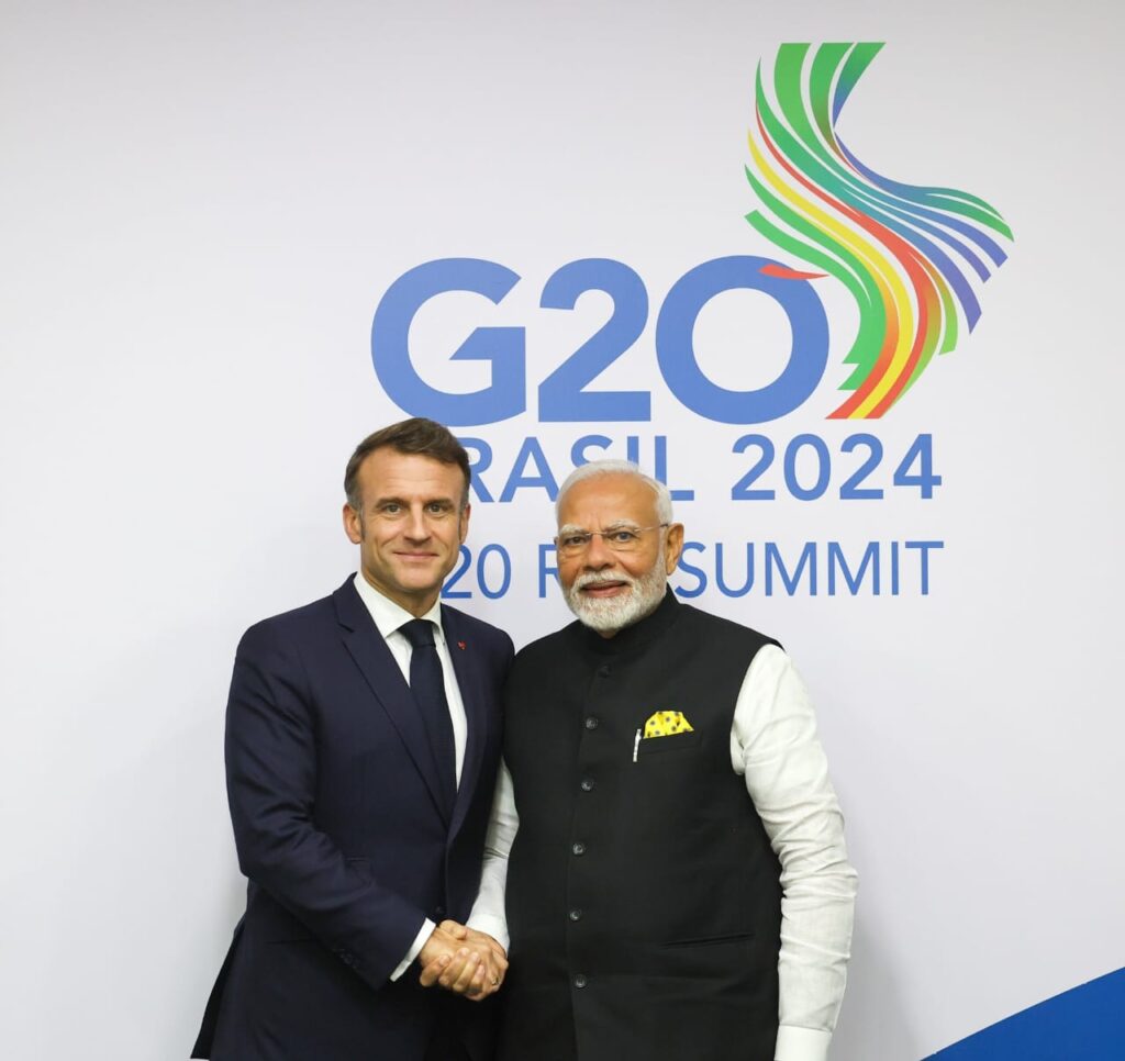 ନୂଆଦିଲ୍ଲୀ : ପ୍ରଧାନମନ୍ତ୍ରୀ ଶ୍ରୀ ନରେନ୍ଦ୍ର ମୋଦୀ ଆଜି ବ୍ରାଜିଲର ରିଓ ଡି ଜେନେରିଓରେ ଜି-୨୦ ଶିଖର ସମ୍ମିଳନୀରେ ଫ୍ରାନ୍ସର ରାଷ୍ଟ୍ରପତି ଇମାନୁଏଲ୍ ମାକ୍ରୋନଙ୍କୁ ସାକ୍ଷାତ କରିଛନ୍ତି । ଜାନୁଆରୀରେ ଗଣତନ୍ତ୍ର ଦିବସ ସମାରୋହର ମୁଖ୍ୟ ଅତିଥି ଭାବରେ ରାଷ୍ଟ୍ରପତି ମାକ୍ରୋନ୍ଙ୍କ ଭାରତ ଗସ୍ତ ପରେ ଏବଂ ଜୁନ୍ ମାସରେ ଇଟାଲୀରେ ଅନୁଷ୍ଠିତ ଜି୭ ଶିଖର ସମ୍ମିଳନୀ ପରେ, ଚଳିତ ବର୍ଷ ଦୁଇ ନେତାଙ୍କ ମଧ୍ୟରେ ଏହା ତୃତୀୟ ବୈଠକ ଥିଲା ।ଏହି ବୈଠକରେ ଦୁଇ ନେତା ଭାରତ-ଫ୍ରାନ୍ସ ରଣନୀତିକ ଭାଗିଦାରୀକୁ ଆଗକୁ ବଢ଼ାଇବା ସହିତ ଦ୍ୱିପାକ୍ଷିକ ସହଯୋଗ ତଥା ଅନ୍ତର୍ଜାତୀୟ ଭାଗିଦାରୀ ପାଇଁ ସେମାନଙ୍କର ସହଭାଗୀ ଦୃଷ୍ଟିକୋଣକୁ ପୁନଃପ୍ରତିପାଦିତ କରିଛନ୍ତି, ଯାହା ହୋରିଜନ୍ ୨୦୪୭ ରୋଡମ୍ୟାପ ଏବଂ ଅନ୍ୟାନ୍ୟ ଦ୍ୱିପାକ୍ଷିକ ଘୋଷଣାରେ ଦର୍ଶାଯାଇଛି ।
