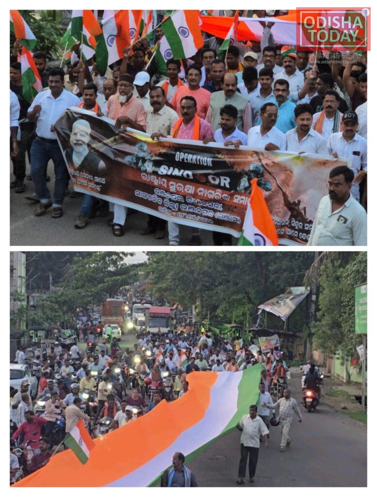 ଭଞ୍ଜନଗର ( ଅମରେନ୍ଦ୍ର କୁମାର ପଟ୍ଟନାୟକ,ଓଡ଼ିଶା ଟୁଡେ): ଅପରେଶନ ସିନ୍ଦୁର’ର ସଫଳତାକୁ ନେଇ ଭାରତୀୟ ସେନାଙ୍କୁ ସମ୍ମାନ ଜଣାଇବା ଓ ଉତ୍ସାହିତ କରିବା ସକାଶେ ବିଭିନ୍ନ ସ୍ଥାନରେ ତ୍ରିରଙ୍ଗା ଶୋଭାଯାତ୍ରା ଚାଲିଛି। ରବିବାର ଭଞ୍ଜନଗର ସହରରେ ବିରାଟ ତ୍ରିରଙ୍ଗା ଶୋଭାଯାତ୍ରା ହୋଇଥିଲା। ଏଥିରେ ଭଞ୍ଜନଗର ବିଧାୟକ ପ୍ରଦ୍ୟୁମ୍ନ କୁମାର ନାୟକ ମୁଖ୍ୟ ଅତିଥି ଭାବେ ଯୋଗଦେଇ ଶୋଭାଯାତ୍ରାରେ ସାମିଲ ହୋଇଥିଲେ।ଶୋଭାଯାତ୍ରା ଭଞ୍ଜନଗର ସହର ପରିକ୍ରମା କରିଥିଲା। ୧୦୦ ମିଟର ଲମ୍ବ ତ୍ରିରଙ୍ଗା ପତାକା ଧରି ଲୋକେ ଶୋଭାଯାତ୍ରାରେ ସାମିଲ ହୋଇଥିଲେ। ଶୋଭାଯାତ୍ରାକୁ ଭାଜପା ଘୁମୁସର ସାଙ୍ଗଠନିକ ଜିଲା ସଭାପତି ନୀଳ ମାଧବ ପାତ୍ର ସଂଯୋଜନା କରିଥିଲେ।ବ୍ଲକ ଅଧ୍ୟକ୍ଷ ନରସଭା ନାୟକ, ଏମପି ପ୍ରତିନିଧି ସନ୍ତୋଷ ତିଆଡ଼ି, ଶିବ ଶଙ୍କର ପ୍ରଧାନ, ରବିନ୍ଦ୍ର ଗୌଡ଼, ଧୋବା ଗୌଡ଼, ଶିବ ପ୍ରସାଦ ମହାପାତ୍ର, ସୁବାସ ଚନ୍ଦ୍ର ବରାଡ଼,ଗିରିଜା ଶଙ୍କର ଭୂୟାଁ, ସନ୍ତୋଷ କୁମାର ପାଳ, ରଞ୍ଜିତ ପାତ୍ର,ଆବାସ ଅଲ୍ଲୀ ଖାନ, ପ୍ରମୁଖ ଉପସ୍ଥିତ ଥିଲେ ।