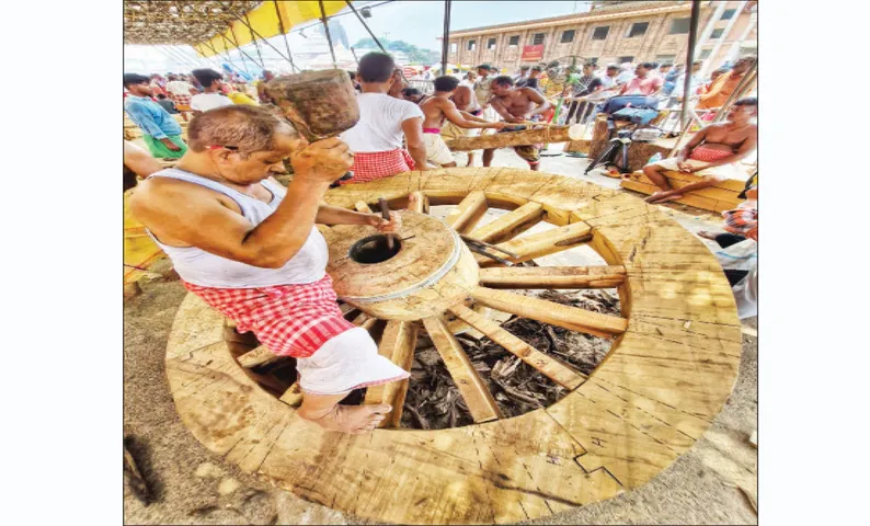 ପୁରୀ(ବଳରାମ ତ୍ରିପାଠୀ, ଓଡ଼ିଶା ଟୁଡେ): ରଥ ନିର୍ମାଣର ୧୭ତମ ଦିନ ସୁଦ୍ଧା ମୋଟ ୧୮ଟି ଚକ ନିର୍ମାଣ ଶେଷ ହୋଇଛି। ଗତକାଲି ସୁଦ୍ଧା ୧୬ଟି ନିର୍ମାଣ ସମ୍ପନ୍ନ ହୋଇଥିଲା। ଏଥିସହ ତିନି ରଥର ୧୧ଟି ଲେଖାଏଁ ସାଲ ଗୁଜ, ୨୪ଟି ତିଖ ଗୁଜ, ୯ଟି ଲେଖାଏଁ ୨୭ଟି ଜଳ ଯନ୍ତ୍ର, ୩୨ଟି କୁଡ଼ୁକା, ୧୨ଟି ଓରା ଏବଂ ୪ଟି ଲେଖାଏଁ ପ୍ରଥମ ଭୂଇଁ ଖମ୍ୱୀ ନିର୍ମାଣ ଶେଷ ହୋଇଛି। ଅପରାହ୍ଣରେ ରଥ ଅମିନ ତିନି ରଥର ଆଗ ଆଣି, ପଛ ଆଣି ମୁହାଁଟ ଏବଂ ଭୂଇଁ ଚଉତା ନିର୍ମାଣ ପାଇଁ ତିନି ରଥଚାଳିକୁ ୪ଟି ଲେଖାଏଁ ୨୦ ଫୁଟିଆ ଧଉରା ଓ ସାହାଜ କାଠ ଯୋଗାଇଛନ୍ତି। ତିନିରଥ ଭୋଇ ସେବକଙ୍କ ସହାୟତାରେ ଏହା ଯୋଗାଇ ଦେବା ପରେ ତିନିରଥ ମହାରଣା ସେବକମାନେ ଦୁଇଟି ଲେଖାଏଁ ମୁହାଁଟ ଓ ଭୂଇଁ ଚଉତା କାଠର ଚଉପଟ କାର୍ଯ୍ୟ ଆରମ୍ଭ କରିଛନ୍ତି। ଭୋଇ ସେବକମାନେ ଯନ୍ତାଗାଡ଼ଠାରେ ତିନି ରଥର ଗୋଟିଏ ଗୋଟିଏ ତୁମ୍ବରେ ଅର ସଂଯୋଗପୂର୍ବକ ସିଙ୍ଗଡ଼ାବାଡ଼ିଆ କାର୍ଯ୍ୟ ଶେଷ କରି ତିନି ରଥ ଚାଳିକୁ ଯୋଗାଇ ଦେଇଛନ୍ତି। ଆସନ୍ତାକାଲି ତିନି ରଥ ମହାରଣା ସେବକମାନେ ତୁମ୍ବ ସିଙ୍ଗଡ଼ା ଉପରେ ପଇ ରଖି ମାପଚିହ୍ନ ଦେବେ। ପଇ ସଂଯୋଗ ପୂର୍ବରୁ ଅର ମୁଖ ସାଲ କାର୍ଯ୍ୟ ସହ ତୁମ୍ବରେ ଅଖ ବିନ୍ଧ ବା ଅଗର ବିନ୍ଧକାର୍ଯ୍ୟ ତୁମ୍ବ ବିନ୍ଧ କାରିଗରଙ୍କ ଦ୍ୱାରା ସମ୍ପନ୍ନ ହେବ। ରୂପକାର ସେବକମାନେ ତିନି ରଥର ୧୧ଟି ଲେଖାଏଁ ସାଲଗୁଜରେ ନୃସିଂହ ରୂପ ଖୋଦେଇ ଜାରି ରଖିଛନ୍ତି। ଦୋଳବେଦୀ ଅସ୍ଥାୟୀ କମାରଶାଳରେ ଓଝା କମାର ସେବକ ତିନି ରଥର ବାକି ଚକ ନିର୍ମାଣ ପାଇଁ ଆବଶ୍ୟକ ପନ୍ଦାରି, ତୁମ୍ବ ବଳା, ଅର କଣ୍ଟା, ପନ୍ଦାରି ଚାବି ନିର୍ମାଣ ଜାରି ରଖିଛନ୍ତି ।