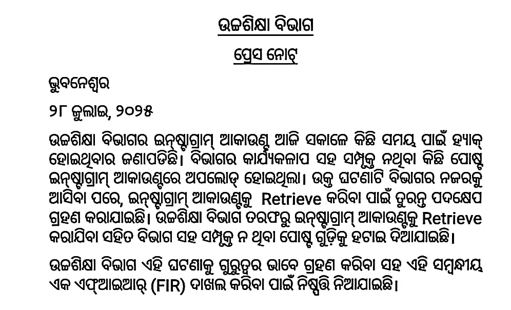 ଭୁବନେଶ୍ବର,୨୮।୭: ଉଚ୍ଚଶିକ୍ଷା ବିଭାଗର ଇନଷ୍ଟାଗ୍ରାମ ଆକାଉଣ୍ଟ ହ୍ୟାକ୍ ହୋଇଯାଇଛି। ଫଳରେ୪ ତାରିଖରୁ ଅଶ୍ଲୀଳ ଓ ବେଟିଙ୍ଗ ଭିଡ଼ିଓ ସବୁ ଅପଲୋଡ଼ ହୋଇଛି। ତେବେ କିଏ ହ୍ୟାକର ତାହା ଏବେ ଯାଏଁ ସ୍ପଷ୍ଟ ହୋଇନି। ସେନେଇ ତଦନ୍ତ ଚାଲିଛି।