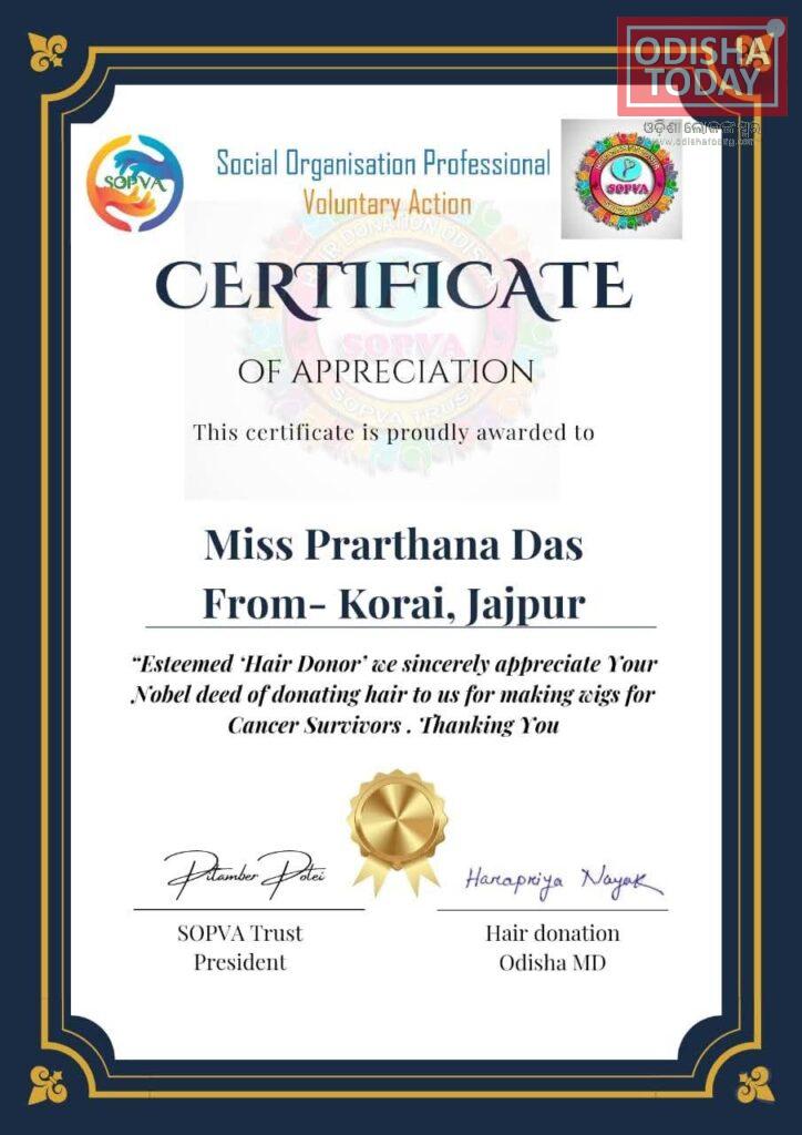 ତେବେ କର୍କଟ ରୋଗୀଙ୍କ ପାଇଁ କେଶ ଦାନ କରିବାକୁ କେବେଠୁ ଇଛା ଥିବା ସହ ଏମିତି ଏକ ମହତ କାର୍ଯ୍ୟରେ ନିଜକୁ ନିୟୋଜିତ କରିଥିବାରୁ ଆତ୍ମସନ୍ତୋଷ ମିଳିଥିବା କହିଛନ୍ତି ପ୍ରାର୍ଥନା ଏବଂ ଅନ୍ୟ ମାନଙ୍କୁ ମଧ୍ୟ କ୍ୟାନ୍ସର ପୀଡ଼ିତଙ୍କ ପାଇଁ କେଶ ଦାନ କରିବାକୁ ଅନୁରୋଧ କରିଛନ୍ତି l କ୍ୟାନ୍ସର ପୀଡିତଙ୍କ କେଶ ଦାନ ପାଇଁ କାର୍ଯ୍ୟରତ ଥିବା ଶୋପଭା ଟ୍ରଷ୍ଟର ମୁଖ୍ୟ ହରପ୍ରିୟା ନାୟକ ମ୍ୟାଡ଼ାମଙ୍କୁ ପ୍ରାର୍ଥନା ଧନ୍ୟବାଦ ଜଣାଇଛନ୍ତି lଏହି ମହତ କାର୍ଯ୍ୟ ପାଇଁ ପ୍ରାର୍ଥନାଙ୍କ ଭାଇ ପ୍ରଦୀପ କୁମାର ଦାସ ଉତ୍ସାହିତ କରିବା ସହ ପରିବାରବର୍ଗ, ବନ୍ଧୁବାନ୍ଧବ ଏବଂ ଗ୍ରାମବାସୀ ଏହି କାର୍ଯ୍ୟକୁ ପ୍ରଶଂସା କରିଛନ୍ତି l ଆଗକୁ ଅଙ୍ଗଦାନ କରିବାକୁ ଇଛା ଥିବା ନେଇ ପ୍ରାର୍ଥନା ପ୍ରକାଶ କରିଛନ୍ତି l