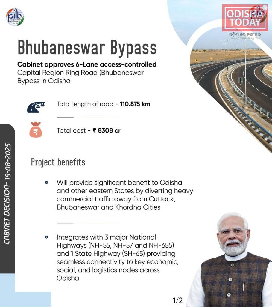 ଅଭିବୃଦ୍ଧି ଓ ସମୃଦ୍ଧି ଲାଗି ନୂତନ ମାର୍ଗ ଖୋଲିବଅଢ଼େଇ ବର୍ଷର ଅବଧି ମଧ୍ୟରେ ପ୍ରକଳ୍ପ ସମ୍ପୂର୍ଣ୍ଣ ହେବା ପରେ ଏହି ବାଇପାସ୍ ସ୍ଥାନୀୟ ଆର୍ଥିକ ବିକାଶରେ ଗୁରୁତ୍ୱପୂର୍ଣ୍ଣ ଭୂମିକା ଗ୍ରହଣ କରିବ। ଏଥି ସହିତ ଏହା ପ୍ରମୁଖ ଧାର୍ମିକ ଓ ଆର୍ଥିକ କେନ୍ଦ୍ର ମଧ୍ୟରେ ଯୋଗାଯୋଗକୁ ସୁଦୃଢ଼ କରିବ। ବାଣିଜ୍ୟ ଓ ଶିଳ୍ପ ବିକାଶ ଲାଗି ନୂତନ ମାର୍ଗ ପ୍ରଶସ୍ତ ହେବ। ଏହି ପ୍ରକଳ୍ପ ଦ୍ୱାରା ପାଖାପାଖି 74.43 ଲକ୍ଷ ମାନବ ଦିବସ ପ୍ରତ୍ୟକ୍ଷ ଏବଂ ପ୍ରାୟ 93.04 ଲକ୍ଷ ମାନବ ଦିବସ ପରୋକ୍ଷ ନିଯୁକ୍ତି ସୁଯୋଗ ସୃଷ୍ଟି ହେବ। ଏହା ମଧ୍ୟ ପାର୍ଶ୍ୱବର୍ତ୍ତୀ ଅଞ୍ଚଳର ବିକାଶ, ଅଭିବୃଦ୍ଧି ଓ ସମୃଦ୍ଧି ଲାଗି ନୂତନ ମାର୍ଗ ଖୋଲିବ।ଧନ୍ୟବାଦ ଜଣାଇଲେ ମୁଖ୍ୟମନ୍ତ୍ରୀକେନ୍ଦ୍ର କ୍ୟାବିନେଟର ନିଷ୍ପତ୍ତି ପରେ ଖୁସି ବ୍ୟକ୍ତ କରିଛନ୍ତି ମୁଖ୍ୟମନ୍ତ୍ରୀ ମୋହନ ଚରଣ ମାଝୀ। ସୋସିଆଲ ମିଡିଆରେ ପୋଷ୍ଟ କରି ପ୍ରଧାନମନ୍ତ୍ରୀ ଓ କେନ୍ଦ୍ର ମନ୍ତ୍ରୀ ନୀତିନ ଗଡ଼କରୀଙ୍କୁ ଏଥିଲାଗି ଧନ୍ୟବାଦ ଜଣାଇଛନ୍ତି ମୁଖ୍ୟମନ୍ତ୍ରୀ।